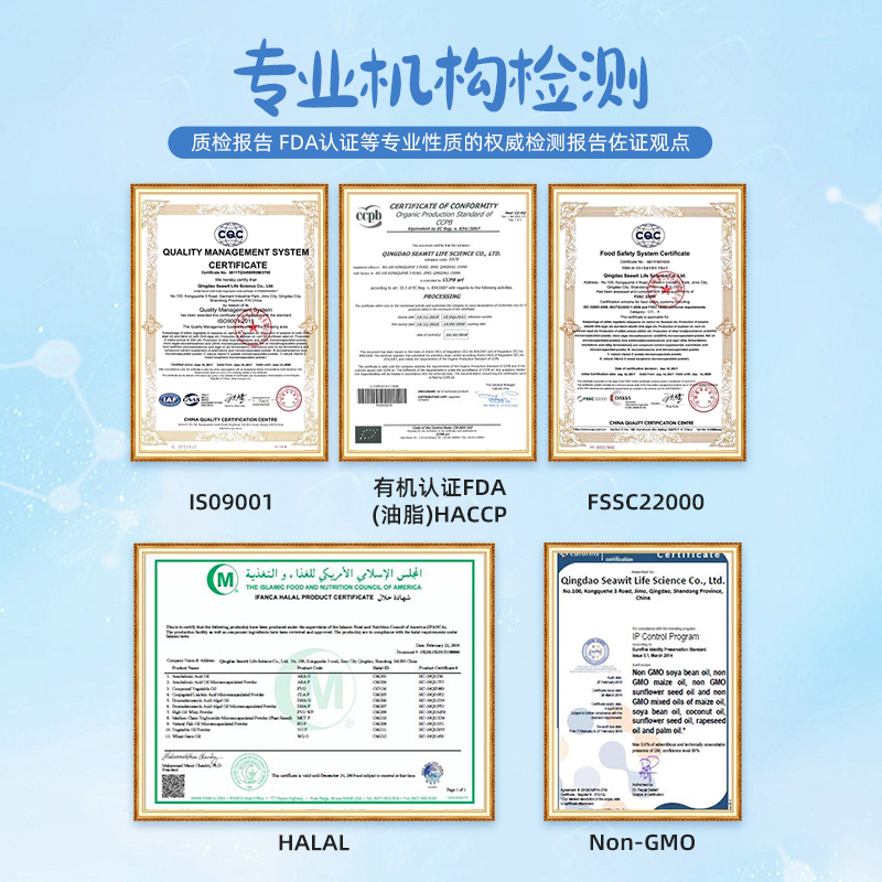 夾心:DHA藻油(250mg/粒)、亞麻籽油(220mg/粒)、花生四烯酸油脂(25mg/粒)、甜橙油