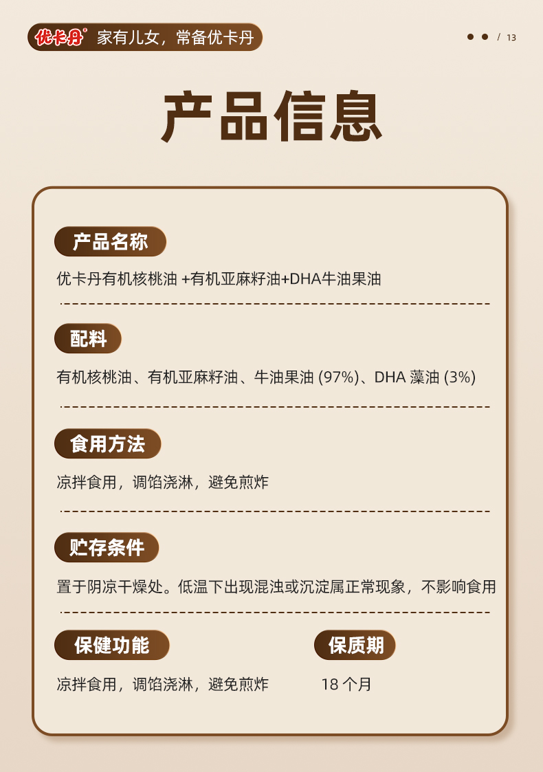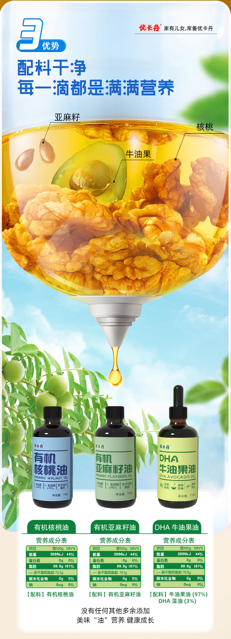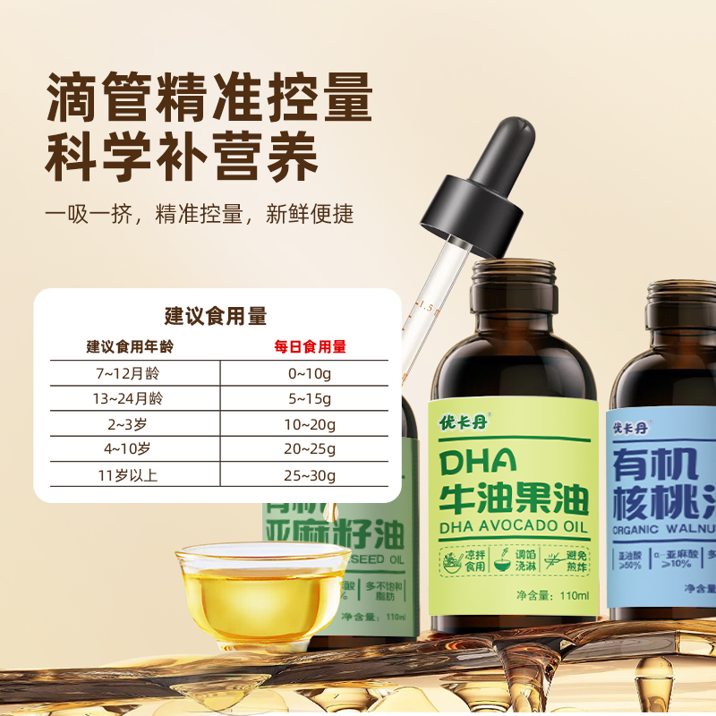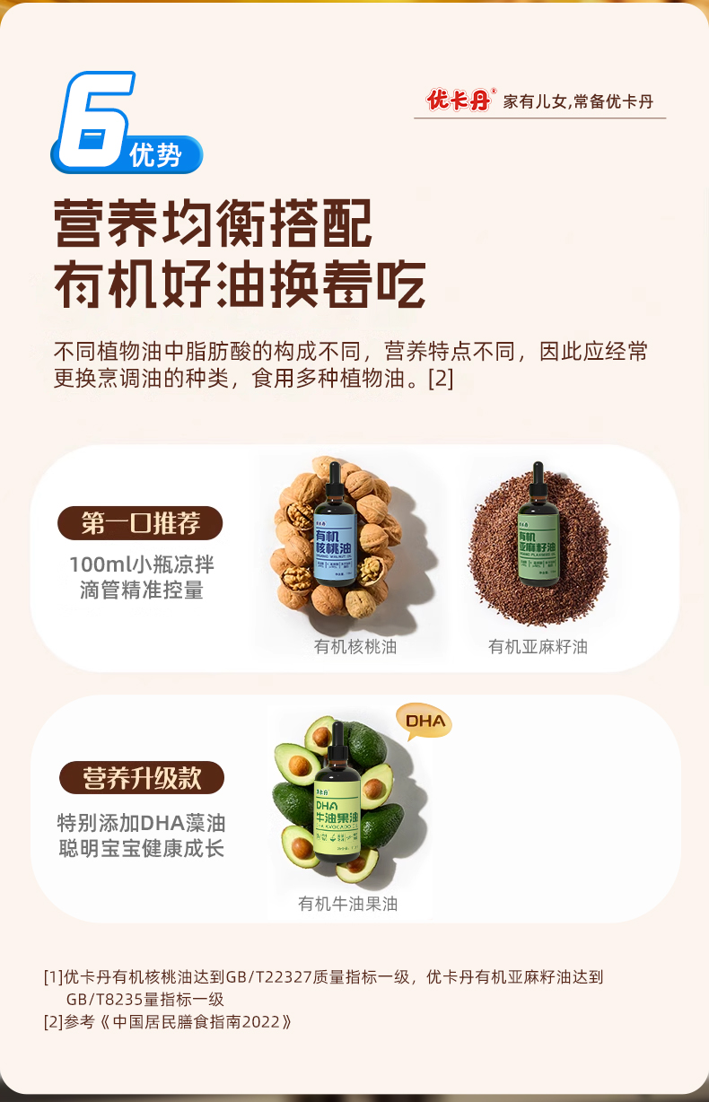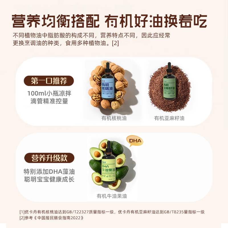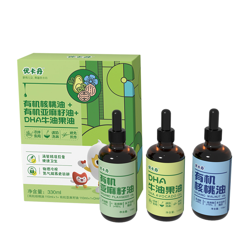 【產(chǎn)品名稱】優(yōu)卡丹有機(jī)核桃油+有機(jī)亞麻籽油+DHA 牛油果油