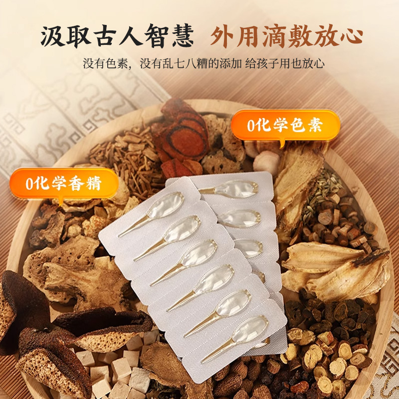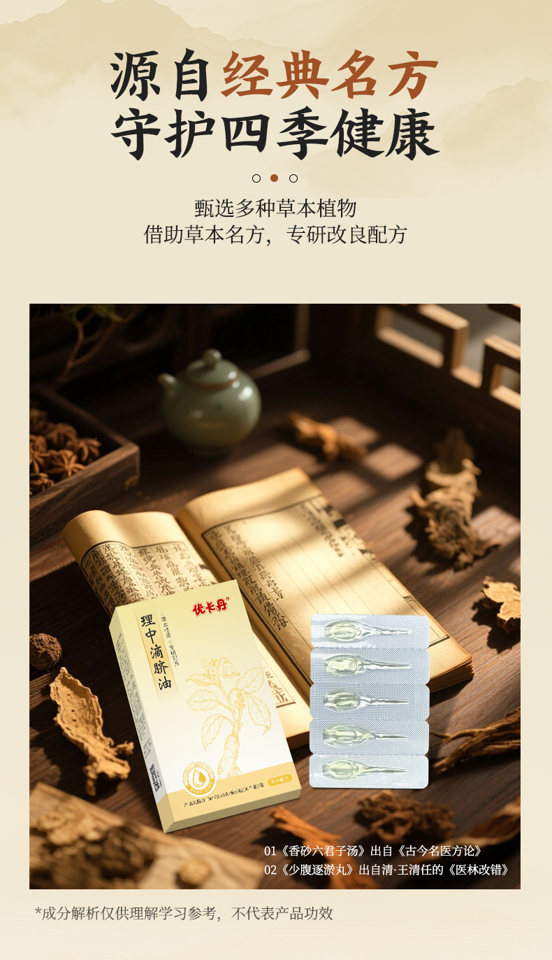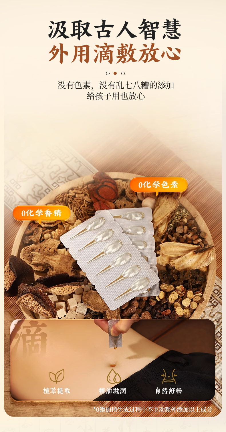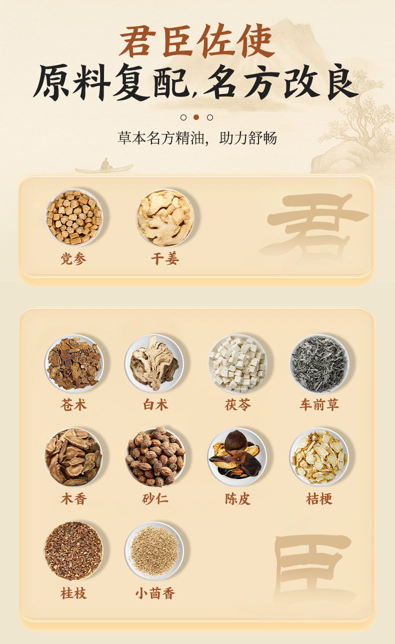 【主要原料】本產品由黨參、白術、茯苓、甘草、木香、砂仁、陳皮、蒼術、車前草、干姜、桂枝、小茴香、當歸、延胡索、白芍、川芎、沒藥,石韋、雞血藤、桔梗、紅花油、薰衣草油、玫瑰果油、維生素E等提煉而成。