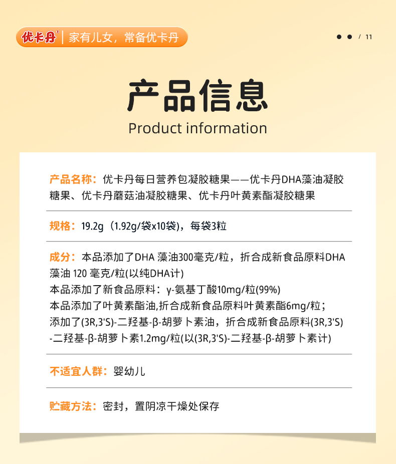 【產(chǎn)品名稱】優(yōu)卡丹每日營養(yǎng)包凝膠糖果——優(yōu)卡丹DHA藻油凝膠糖果、優(yōu)卡丹蘑菇油凝膠糖果、優(yōu)卡丹葉黃素酯凝膠糖果