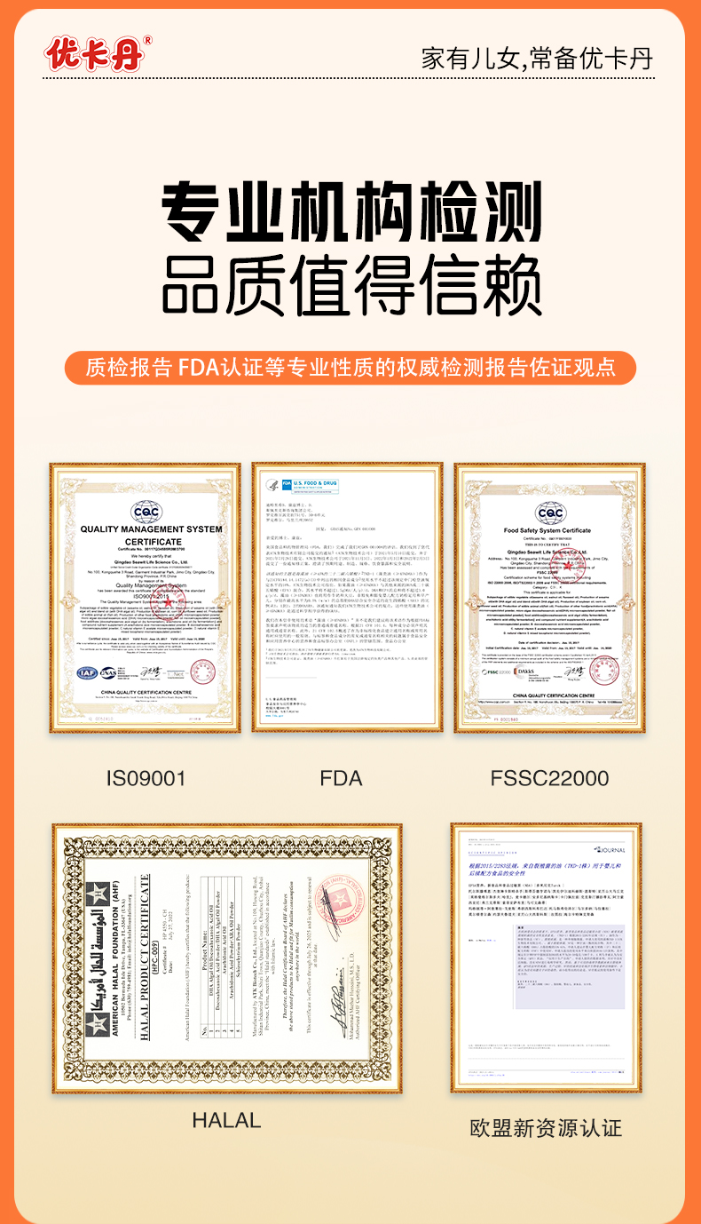 給孩子選營養品,靠譜二字最讓家長安心。優卡丹DHA 藻油+ ARA凝膠糖果不僅通過了 ISO9001、FDA、FSSC22000 等國際權威檢測認證,還手握3項中國專利,從配方研發到生產技術都經過專業驗證。