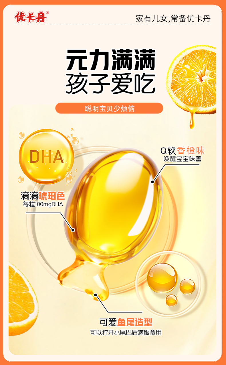很多DHA產品都帶有難以避免的腥味,孩子一聞就躲,喂起來特別費勁。而優卡丹這款凝膠糖果采用清新香橙口味,酸甜可口,質地Q軟,就像孩子喜歡的小零食。