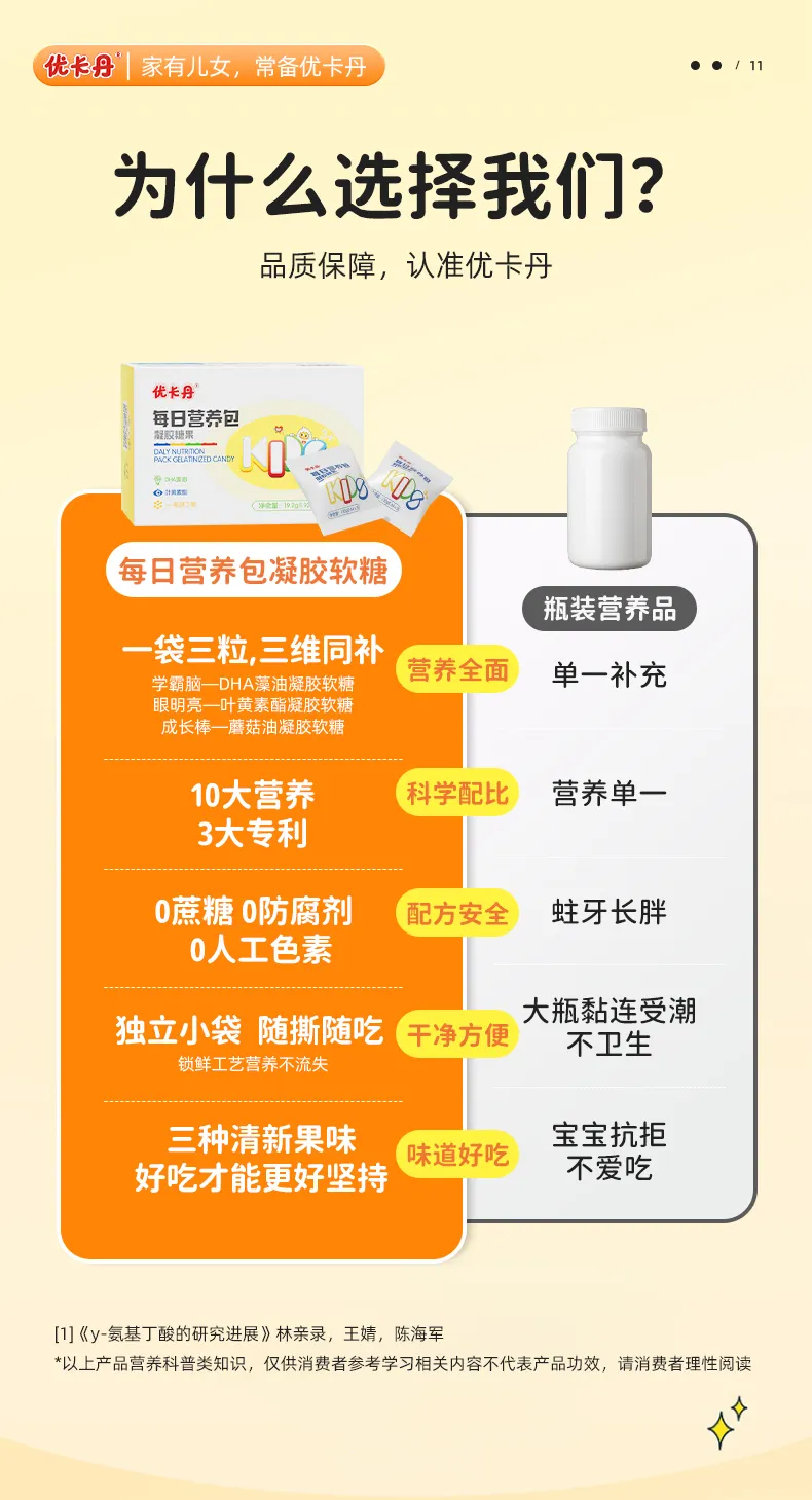 家有兒女,常備優卡丹,優卡丹每日營養包凝膠糖果,專為中國3-12歲兒童設計的成長支持,它不只提供營養,更希望實現精準、協同的“三維守護”,讓關愛不再分散: