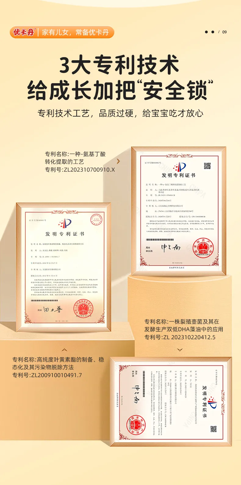 專利技術,高效吸收:優卡丹榮獲三項國家專利技術,致力于提升核心成分的純度和生物利用度。我們相信,吃進去能被高效吸收,才是真正的補充。