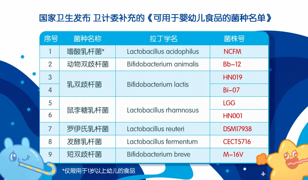以優(yōu)卡丹多株活性即食型乳酸菌為例,核心菌株均源自《可用于嬰幼兒食品的菌種名單》,特別配伍乳雙歧桿菌與鼠李糖乳桿菌LGG。