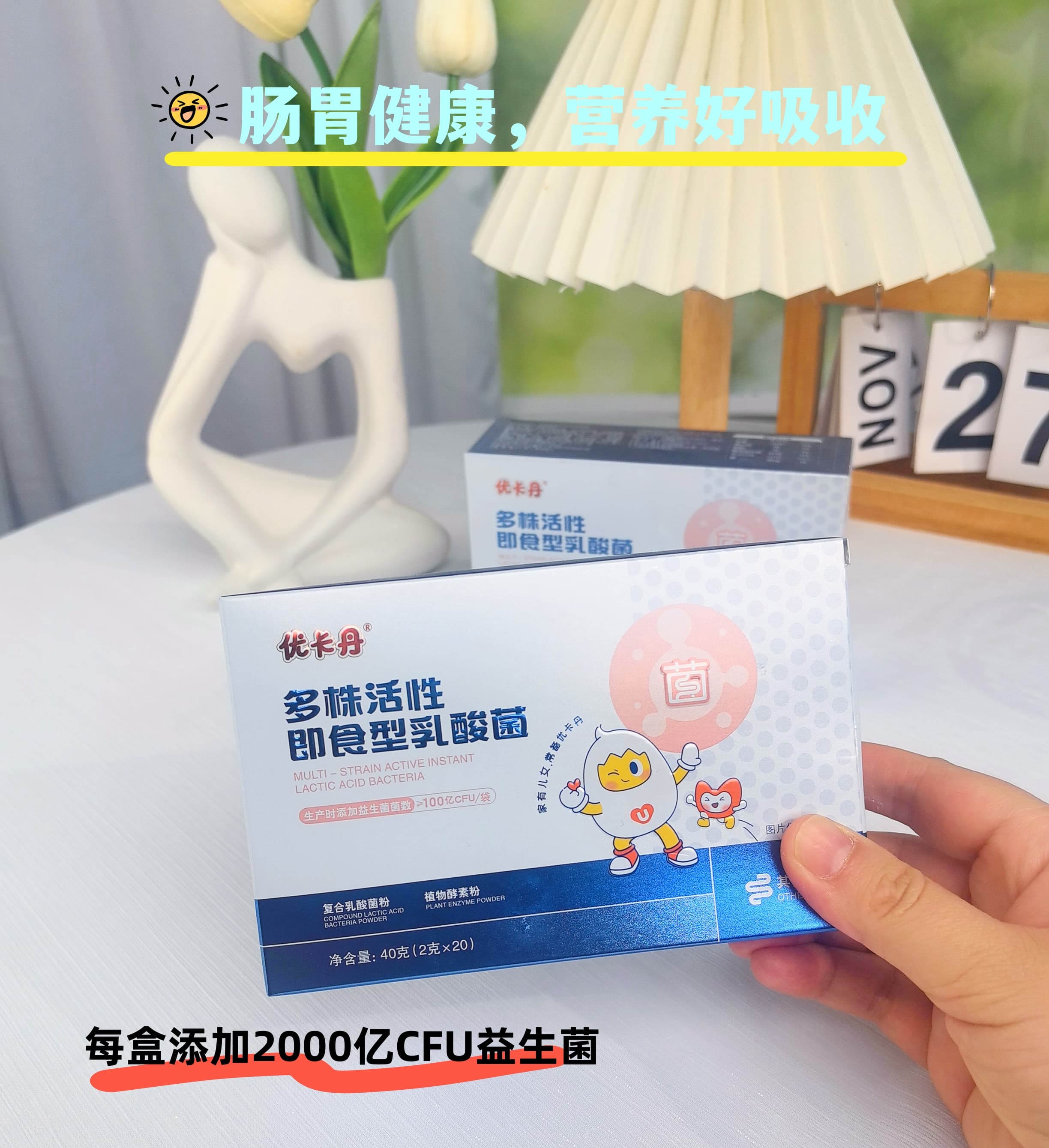 優(yōu)卡丹即食型乳酸菌,不僅嚴(yán)選乳雙歧桿菌、鼠李糖乳桿菌LGG等嬰幼兒專用菌株,更實(shí)現(xiàn)每盒高達(dá)2000億CFU的活菌添加。