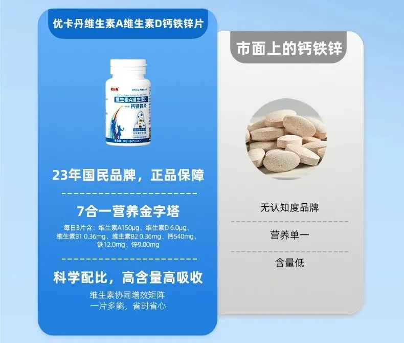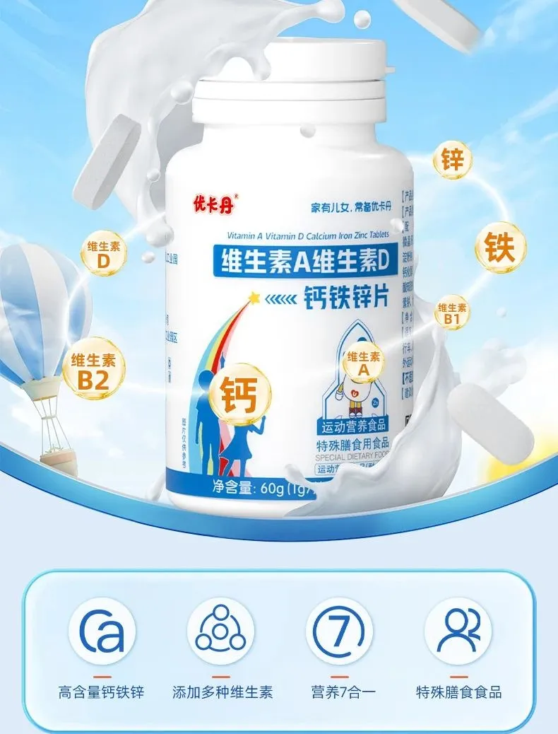 優(yōu)卡丹維生素A維生素D鈣鐵鋅片,以維生素A、D這對“成長黃金搭檔”為核心,同步搭配B1、B2,以及鈣、鐵、鋅等5種兒童易缺營養(yǎng)素,7項(xiàng)同補(bǔ),滿足孩子多維度成長需求。