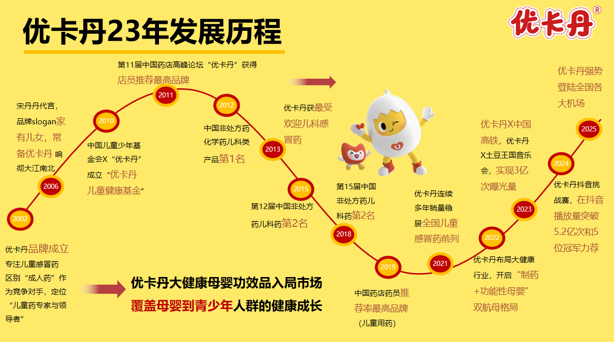 優(yōu)卡丹創(chuàng)立于2002年,專注兒童健康成長23年,“家有兒女,常備優(yōu)卡丹”大家耳熟能詳,優(yōu)卡丹在80后、90后心中擁有極高的知名度和好感度,“優(yōu)卡丹”商標更是被國家認定為“中國馳名商標”。2022年,優(yōu)卡丹布局大健康行業(yè),開啟“制藥+功能性母嬰”雙航母格局。